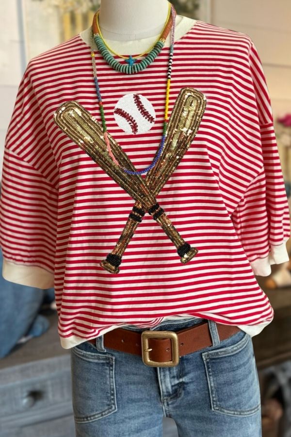 Our new Baseball Sequin Cotton Tee is made of premium cotton for all-day comfort and style. Its relaxed fit and unique sequin detailing make it perfect for casual outings or baseball games.