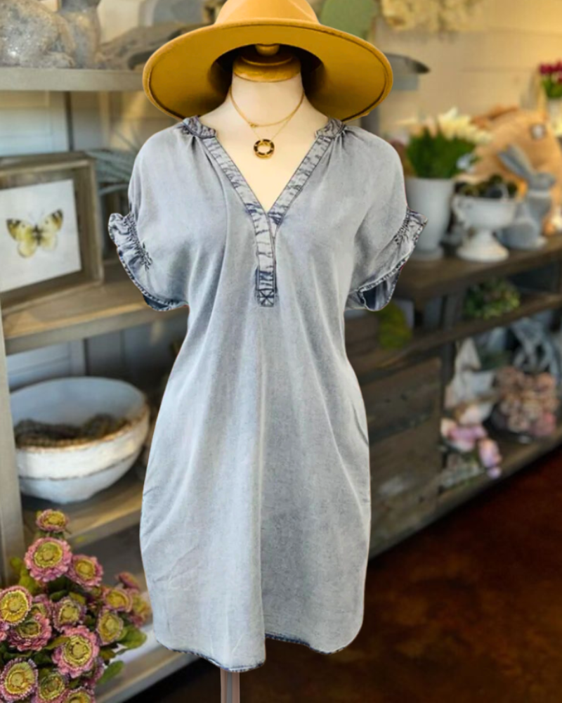 Lightweight denim, light wash design, V-neck, flying sleeves, double side pockets, basic style, loose, easy to spend summer!