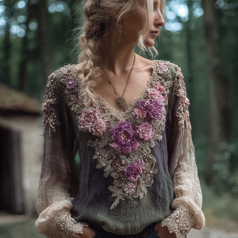 Bohemian Style Round Neck Long Sleeve 3d Purple Flower Design Cotton And Linen Top For Women 12