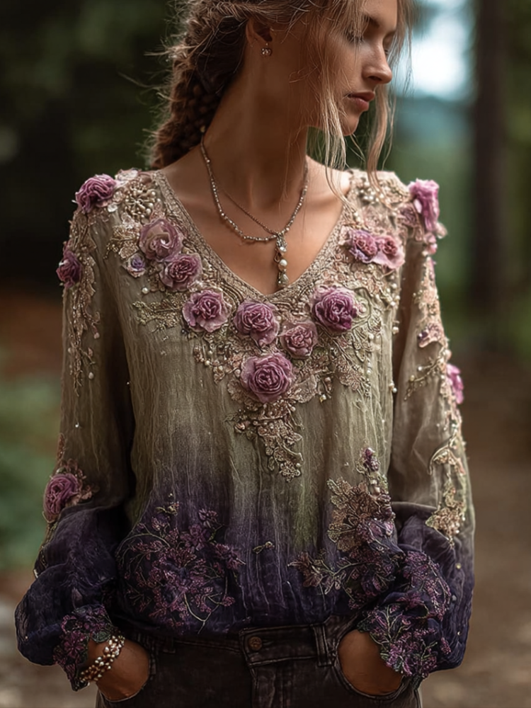 Bohemian Style Round Neck Long Sleeve 3d Purple Flower Design Cotton And Linen Top For Women