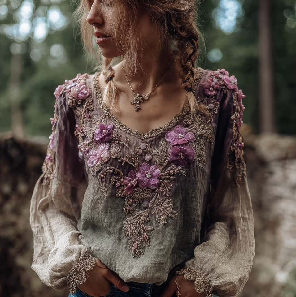 Bohemian Style Round Neck Long Sleeve 3d Purple Flower Design Cotton And Linen Top For Women