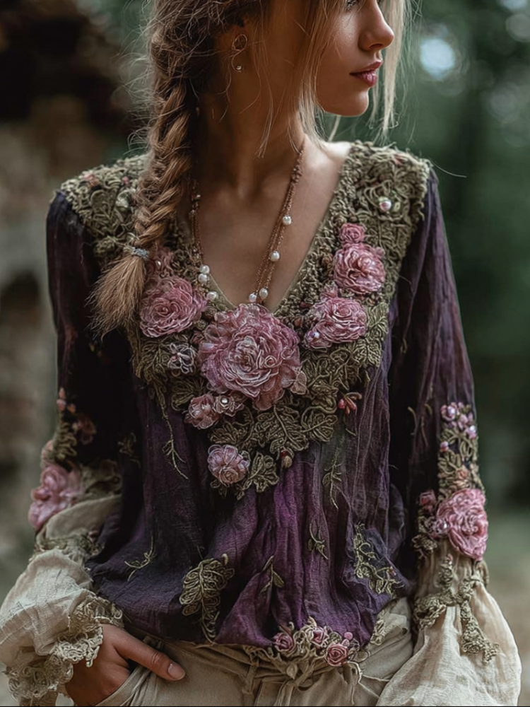 Bohemian Style Round Neck Long Sleeve 3d Purple Flower Design Cotton And Linen Top For Women
