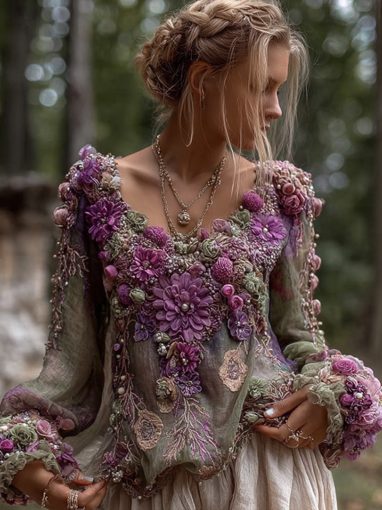 Bohemian Style Round Neck Long Sleeve 3d Purple Flower Design Cotton And Linen Top For Women