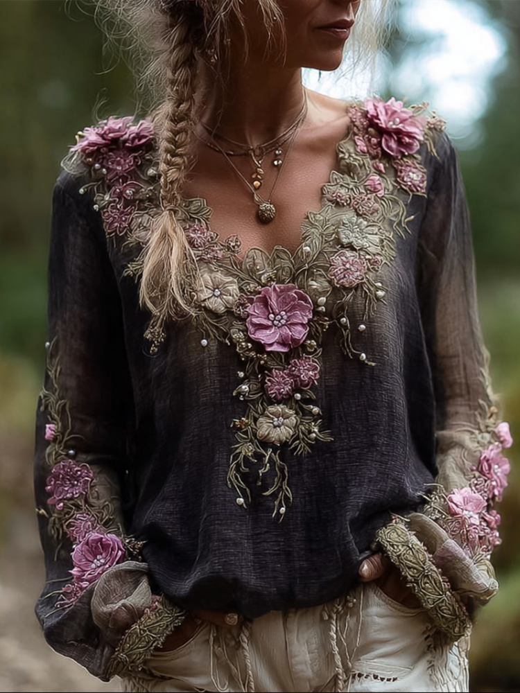 Bohemian Style Round Neck Long Sleeve 3d Purple Flower Design Cotton And Linen Top For Women