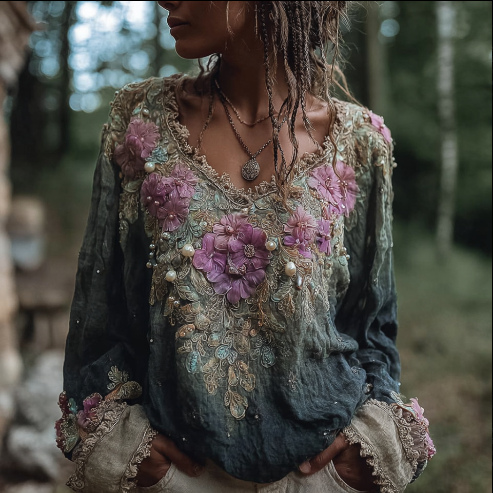 Bohemian Style Round Neck Long Sleeve 3d Purple Flower Design Cotton And Linen Top For Women