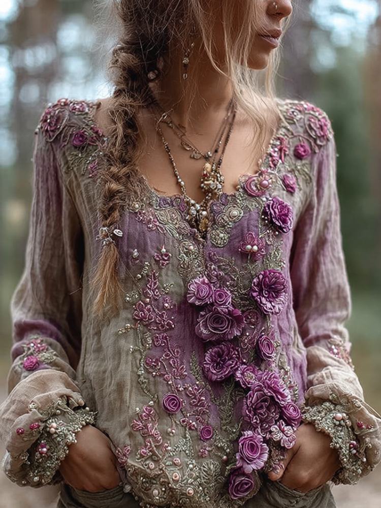 Bohemian Style Round Neck Long Sleeve 3d Purple Flower Design Cotton And Linen Top For Women