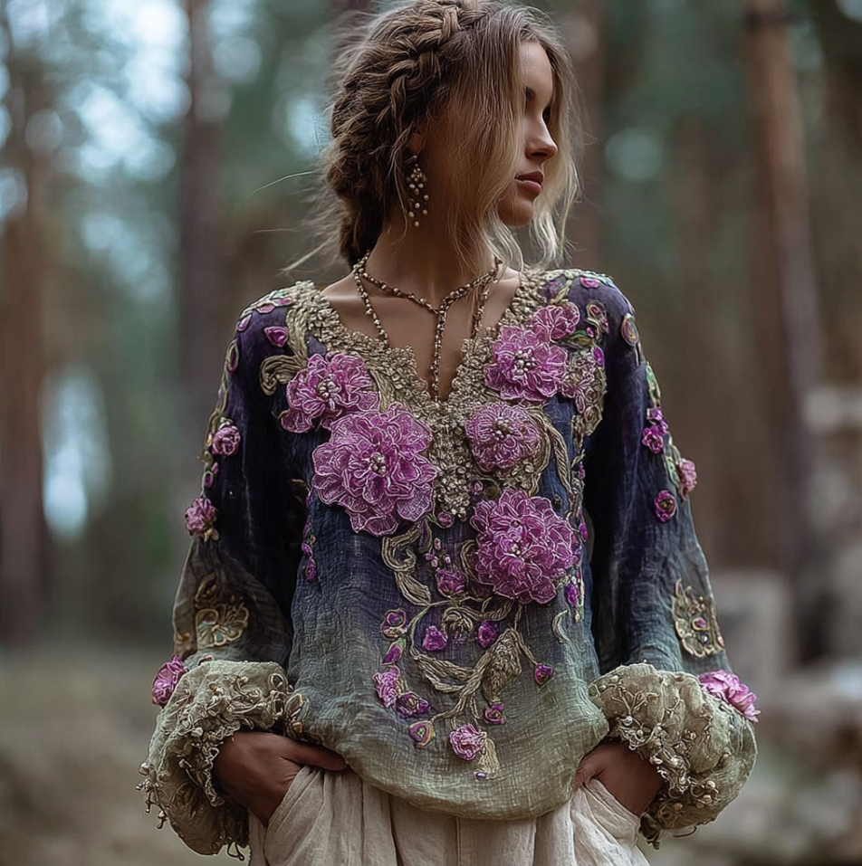 Bohemian Style Round Neck Long Sleeve 3d Purple Flower Design Cotton And Linen Top For Women