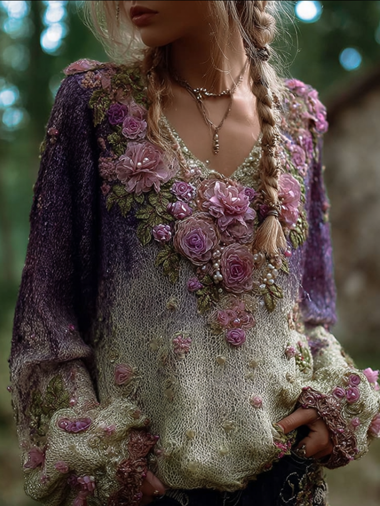 Bohemian Style Round Neck Long Sleeve 3d Purple Flower Design Women's Sweater