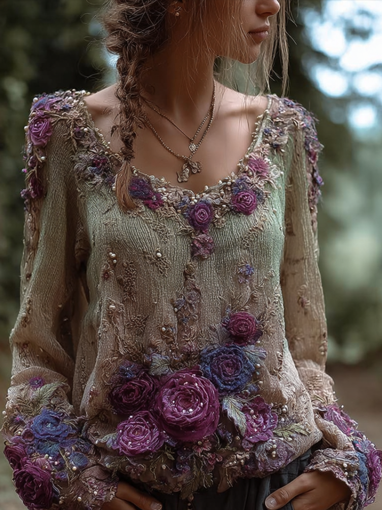 Bohemian Style Round Neck Long Sleeve 3d Purple Flower Design Women's Sweater