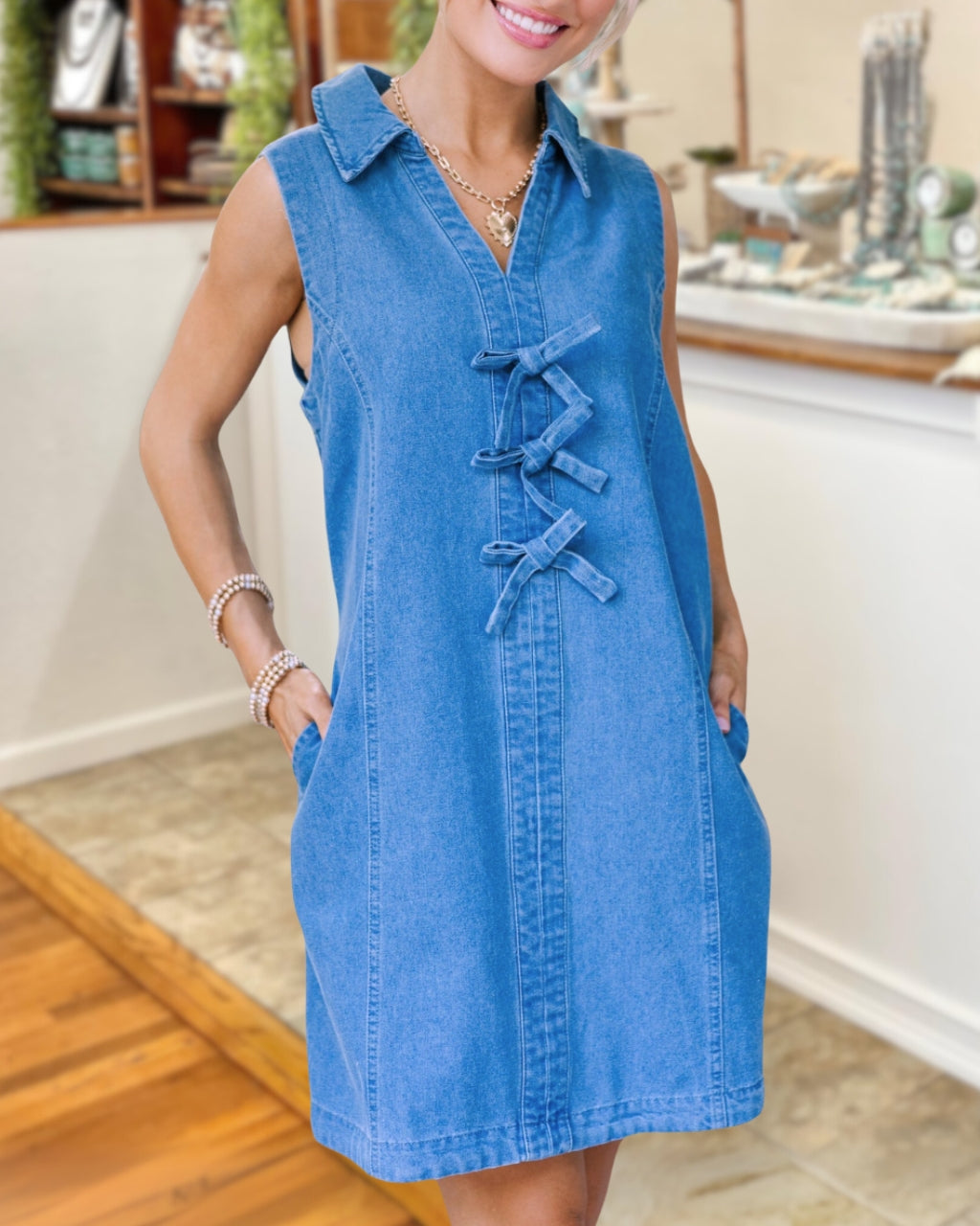 Sleeveless soft wash denim dress, V-neck, front bow detail, knee high hem.