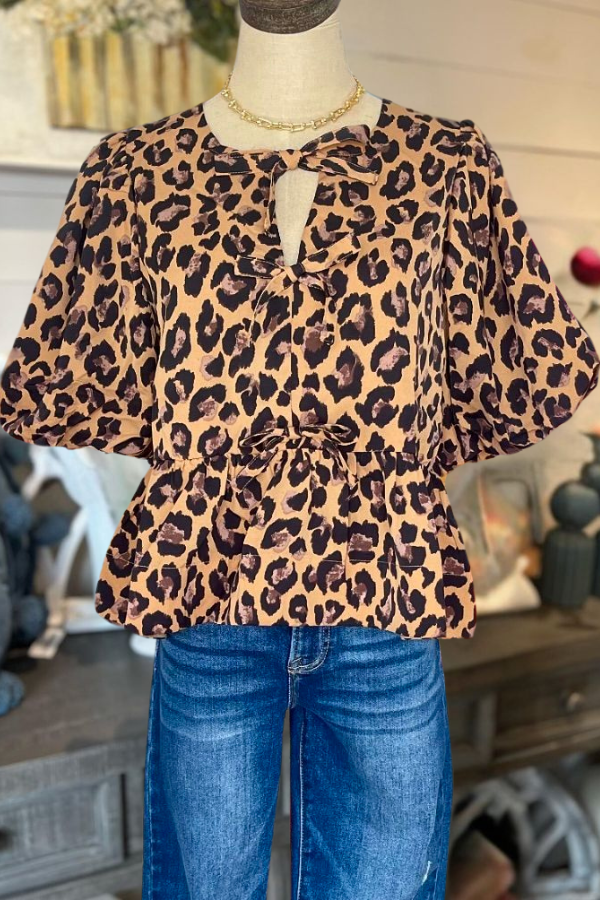 This sophisticated leopard print top features a delicate bow, charming ruffles, and a flattering V-neck design.