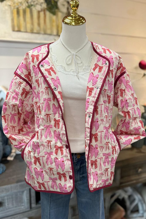 With its unique bow decoration and quilted cotton craftsmanship, this floral jacket perfectly combines femininity with modern fashion.