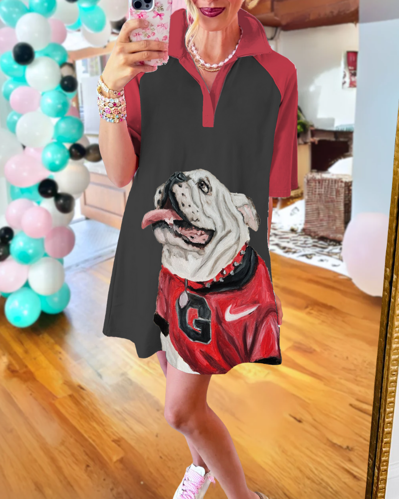 The dress features a playful bulldog drawing, with contrasting trim and a half-open collar design for added style.