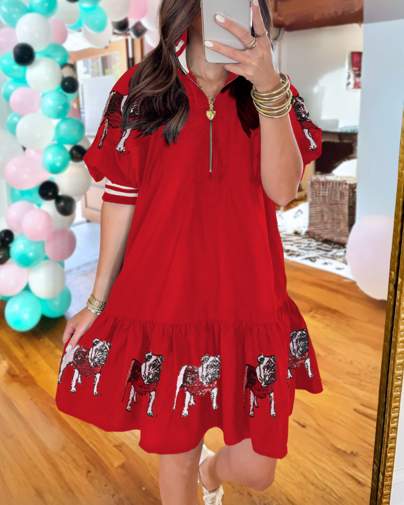 Show off your fashion side with this Bulldog Sequin Half-Zip Dress. Featuring sparkling bulldog sequins, bubble short sleeves, and sporty striped trim, it brings a fun, energetic vibe.