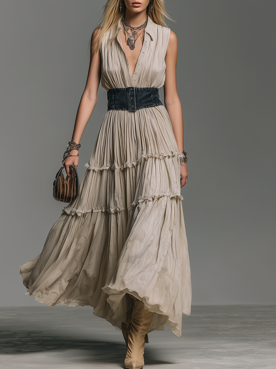 Casual And Stylish Shirt Collar Sleeveless A-line Chiffon Maxi Dress