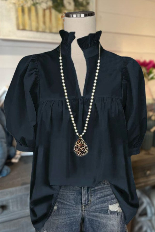 Elevate your style this summer with our V-Neck Flare Sleeve Blouse. Crafted from high-quality satin for a smooth, glossy finish, it features a V-neckline, ruffled high collar with pleats, lantern-style sleeves and chest pleats. Versatile and designed with a loose fit, it pairs effortlessly with any bottom for any occasion.