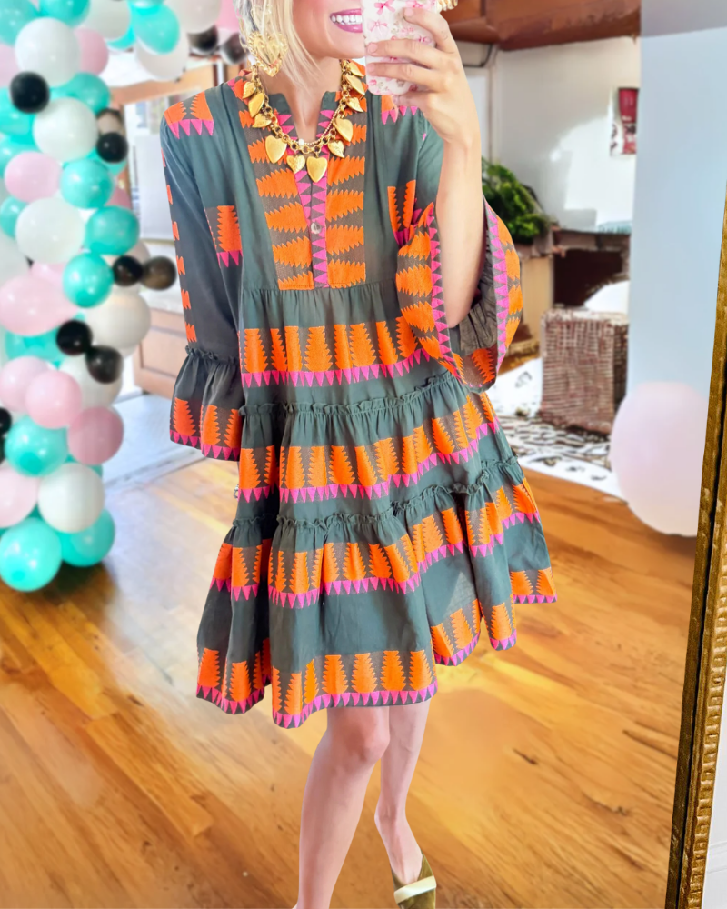 This chic jacquard half-open collar design dress with puff sleeves adds a playful touch. Color-blocking and layered details make the overall look richer and more interesting, making it easy to become the focal point of the party.
