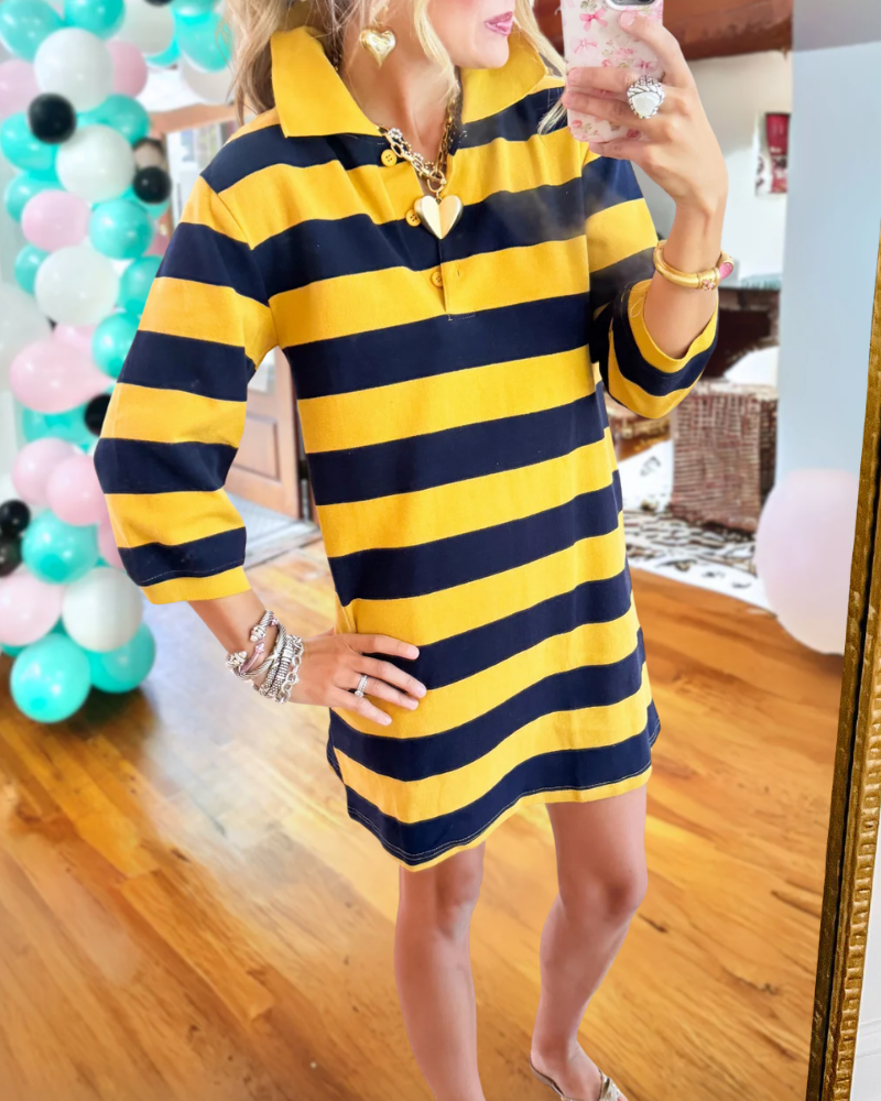 Bring fun and flair to your wardrobe with this half-open collar Color block Striped Dress. Its bold, chunky stripes and vibrant color block design add a lively twist to a timeless silhouette.