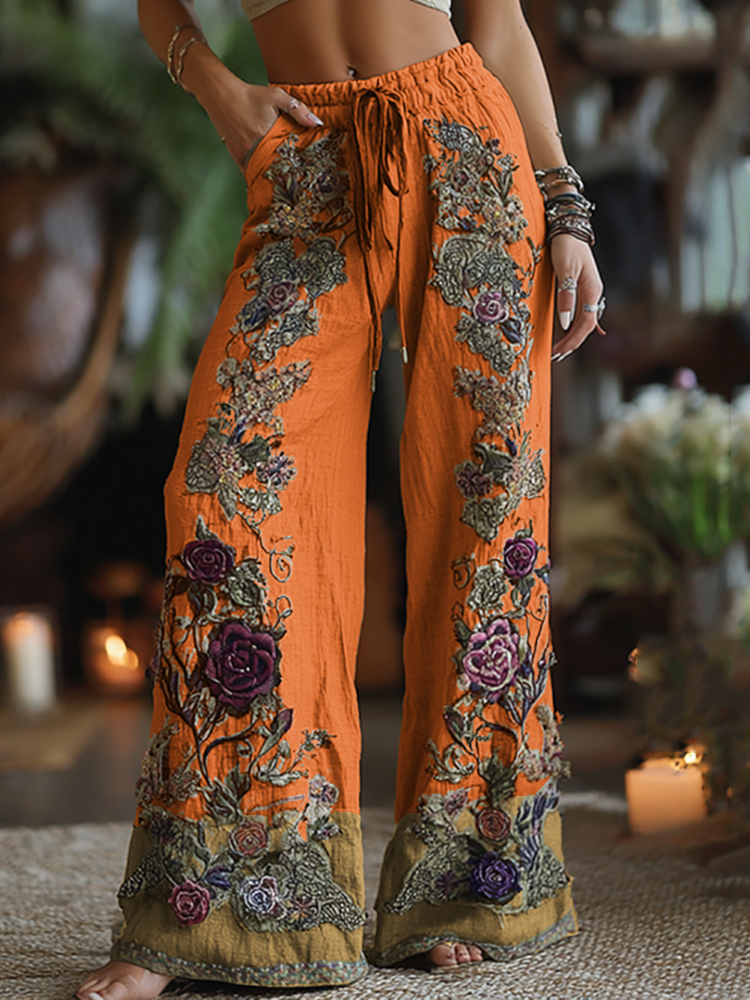 Classy Purple Lavender And Floral Embroidered Art Linen Pants