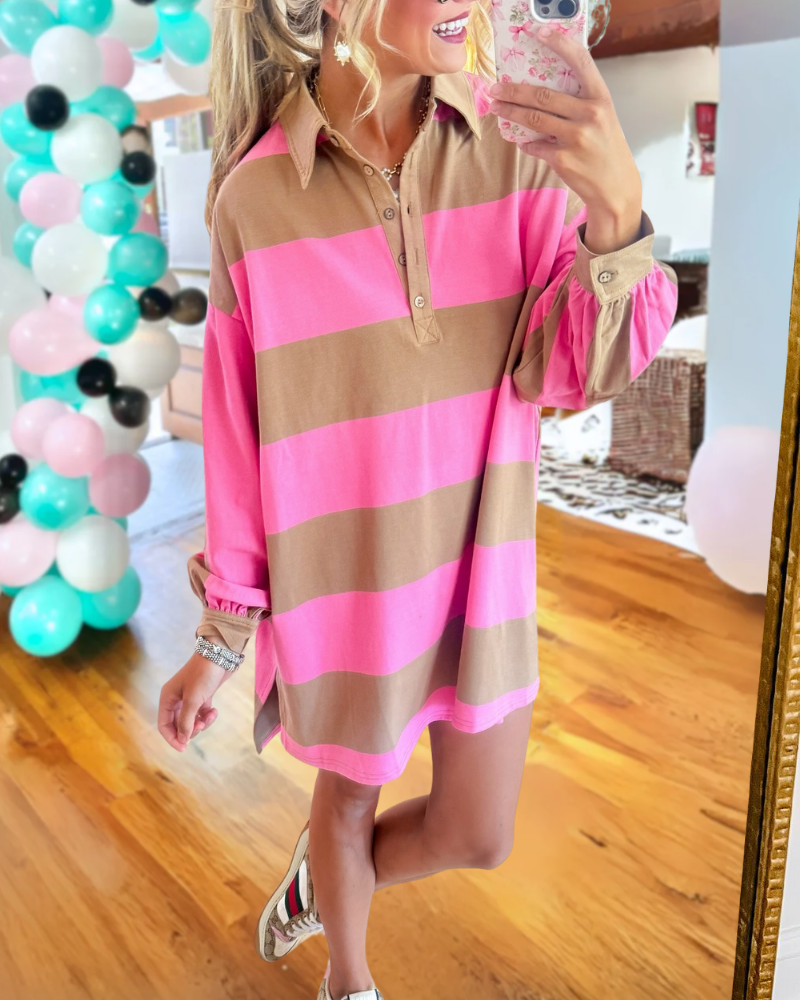 This mini dress features a sleek color-blocking design with half-open collar buttons for a chic touch. Easily show youthful vitality and confidence.