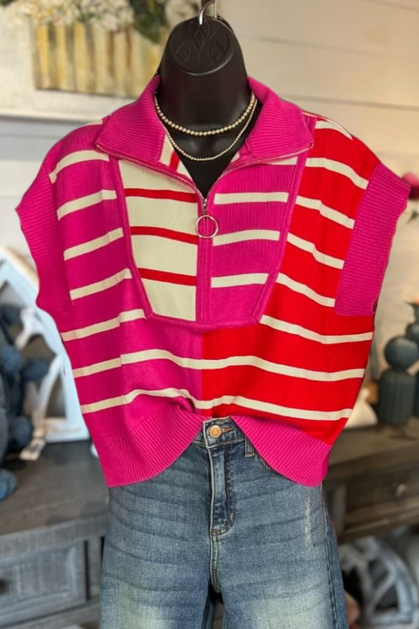 A fusion of magenta and off-white! Lapel, zipper adjustment at the neckline, sleeveless, loose cut, wear alone or with a top!