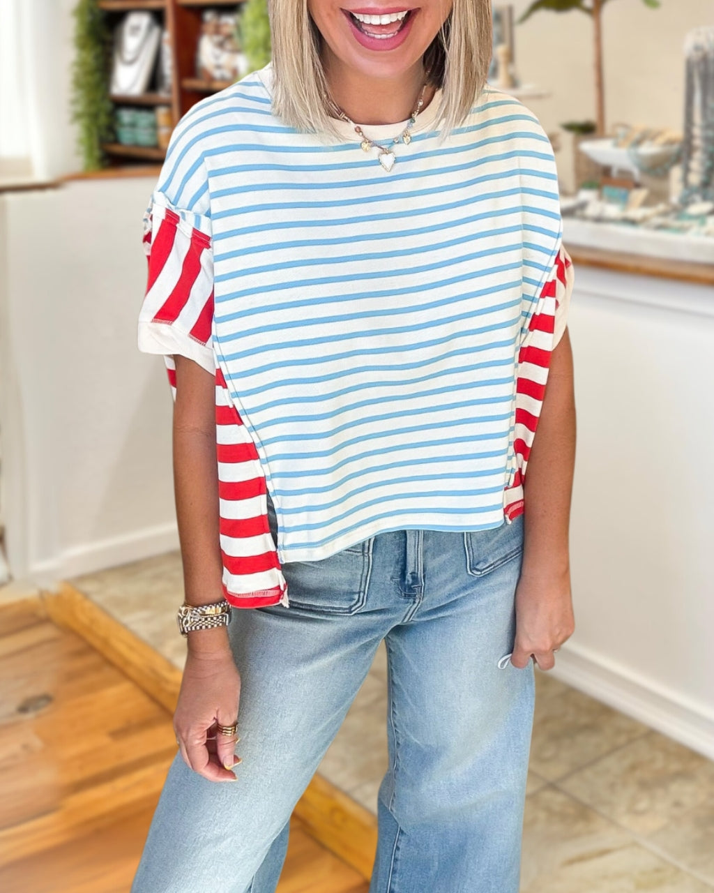 Show off your patriotic style with our USA Stripe Crop Tee. Featuring a cropped boxy fit and a mix of blue and red stripes, this tee is a must-have for a casual yet fashionable look. Represent your country in style!
