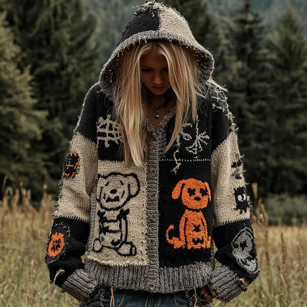 Contrast Color Dog Spiderweb Patchwork Sewn Cozy Knitted Hooded Cardigan