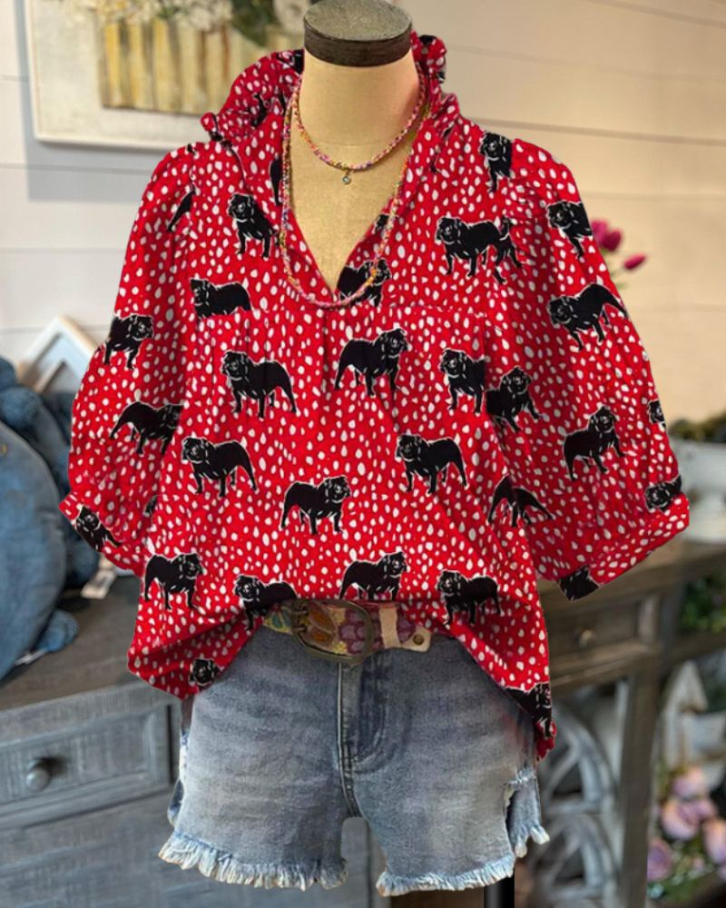 V-Neck, Ruffled Collar, Pleated Front, Lantern-Style Short Sleeves, Loose Fit.