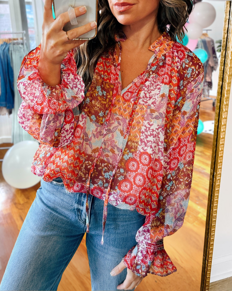 Introducing our Floral Printed Bubble Blouse, featuring a beautiful floral print and puffy sleeves for a feminine look.