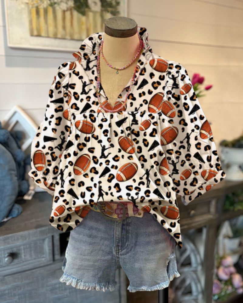 Football + Leopard Pleated Top! V-Neck, Ruffled Collar, Pleated Front, Lantern-Style Short Sleeves, Loose Fit. Combines Football & Leopard Prints , Perfect for Festive Occasion. Showcase your style & addness to your wardrobe. GET this must-have item today!