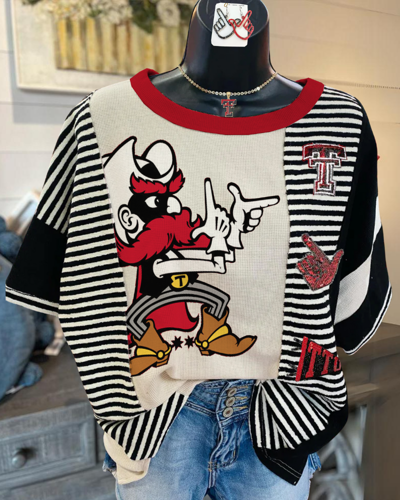 This tee is based on striped stitching, incorporating fun cartoon prints and exquisite patchwork design, with comfortable and skin friendly knit fabric. The unique pattern combination and contrasting collar create a trendy and personalized style, suitable for daily casual and campus wear, easily showcasing youthful vitality and fashionable attitude.