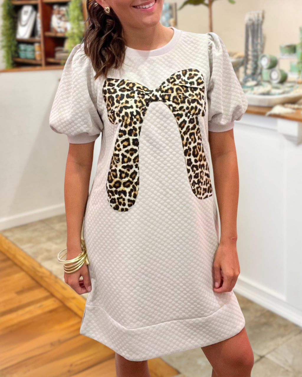 This dress is crafted with delicate textured fabric to create an elegant silhouette, with a leopard print bow design that highlights the visual focus, and bubble sleeves adding a vintage charm. The intimate pocket incorporates practical ingenuity, making it a fashionable choice for daily commuting and leisure gatherings.