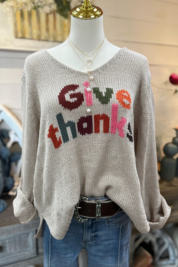 This V-neck sweater features a "Give Thanks" print design, conveying a warm message of gratitude. The knitting craftsmanship creates a soft and comfortable wearing experience.