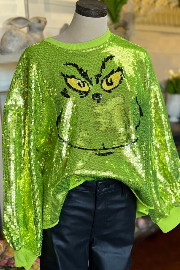 - The cutest, lime green sweatshirt, with all over sequins and grinch design. Runs roomy. This cozy sweatshirt features an eye-catching design, with a roomy fit and the classic lime green hue sure to stand out from the crowd.