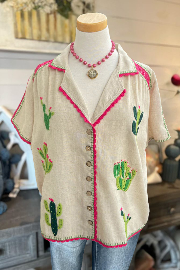 This stylish shirt features eye-catching cactus embroidery designs that add a touch of whimsy to your outfit, while the red trim details provide a pop of color to complete the look.