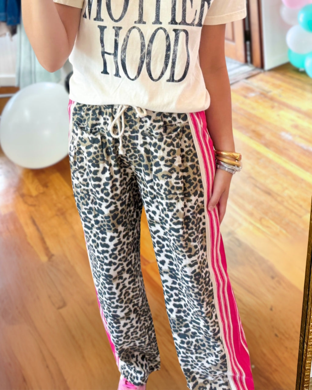 Trendy leopard pants with neon pink stripes and handy pockets. Comfy drawstring waist and roomy wide-leg fit. Size up for a perfect fit!