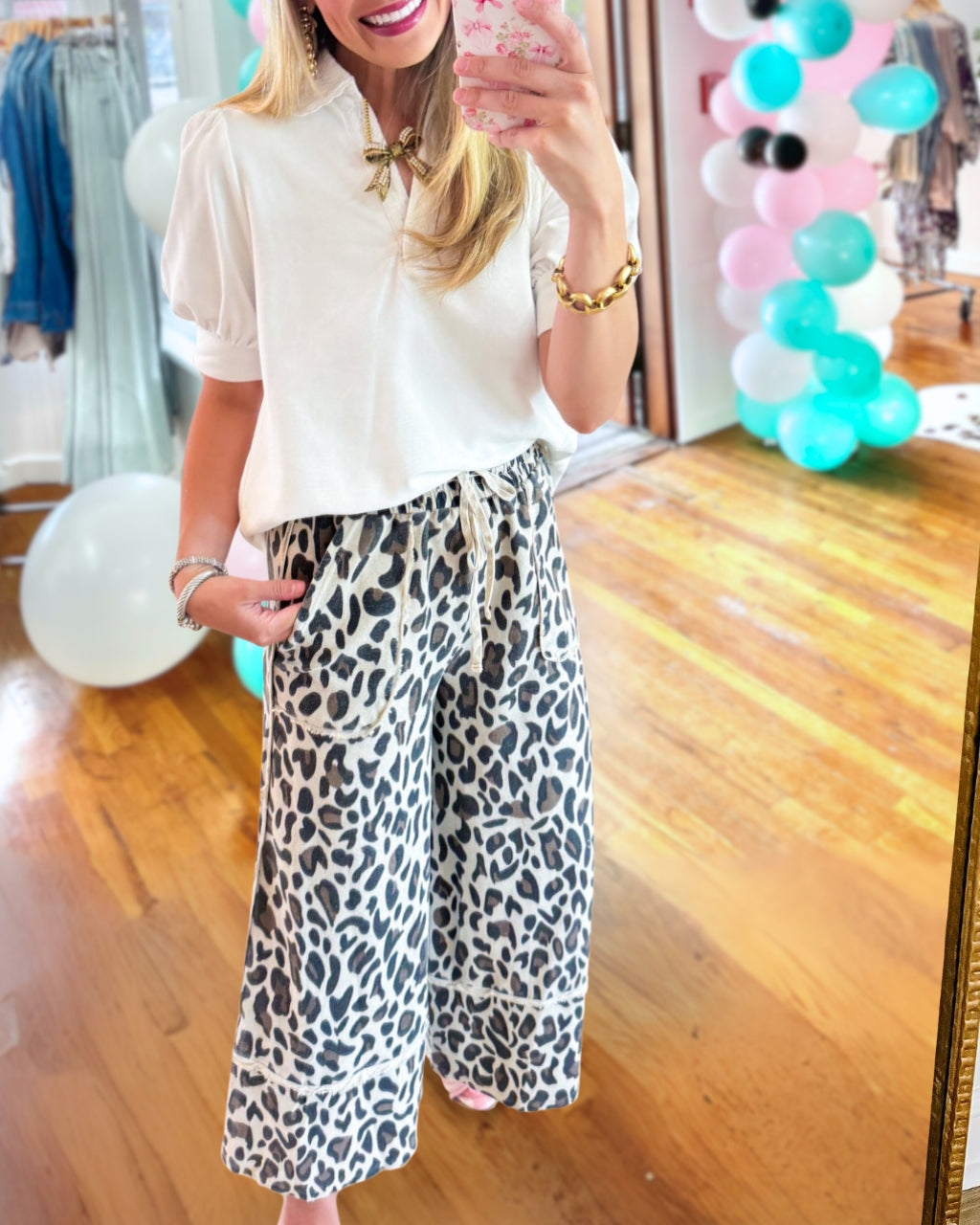 The Leopard Print Terry Wide Leg Pants feature an elastic waist and drawstring, with front pockets and a wide leg design.