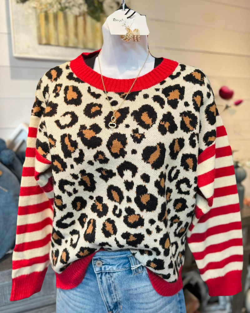 This round-neck sweater cleverly combines leopard print and stripe elements, blending wildness and fashion.