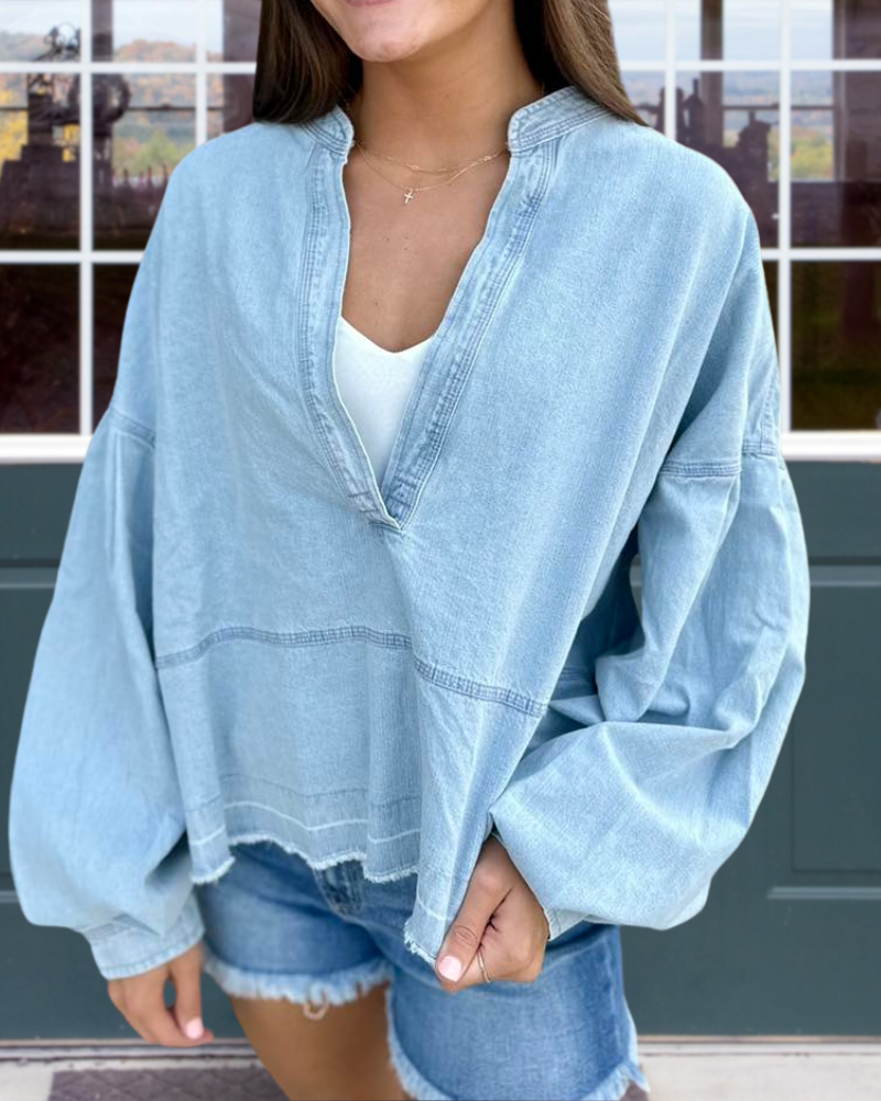 This denim top has an oversized pullove. It features a relaxed fit that is both comfortable and stylish.