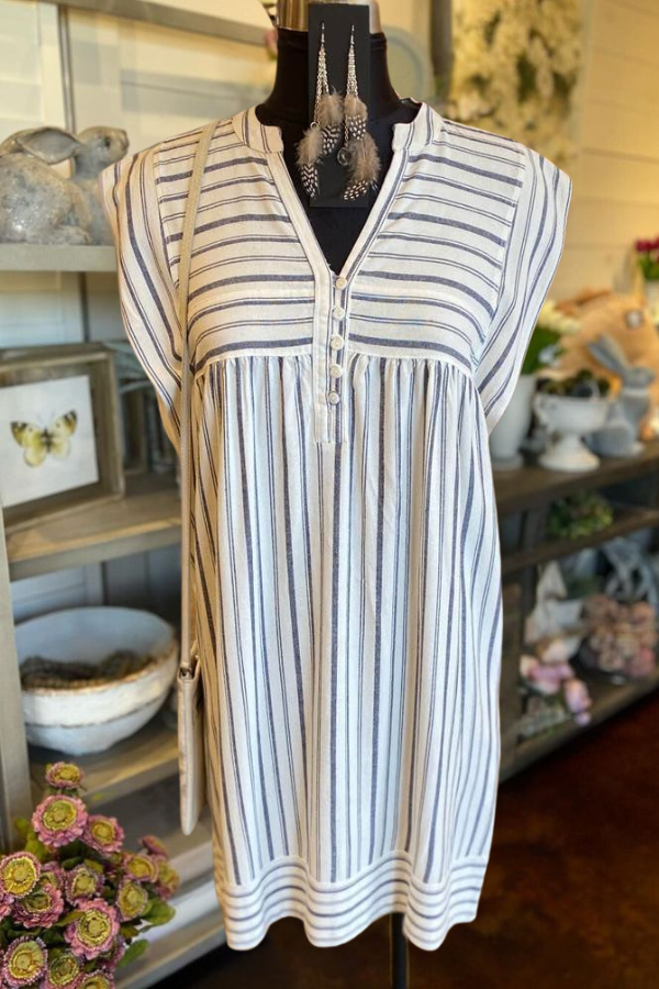 Elevate your style with this striped mini dress featuring a button half-placket and cap sleeves. The straight silhouette offers a comfortable fit, perfect for relaxing in style.