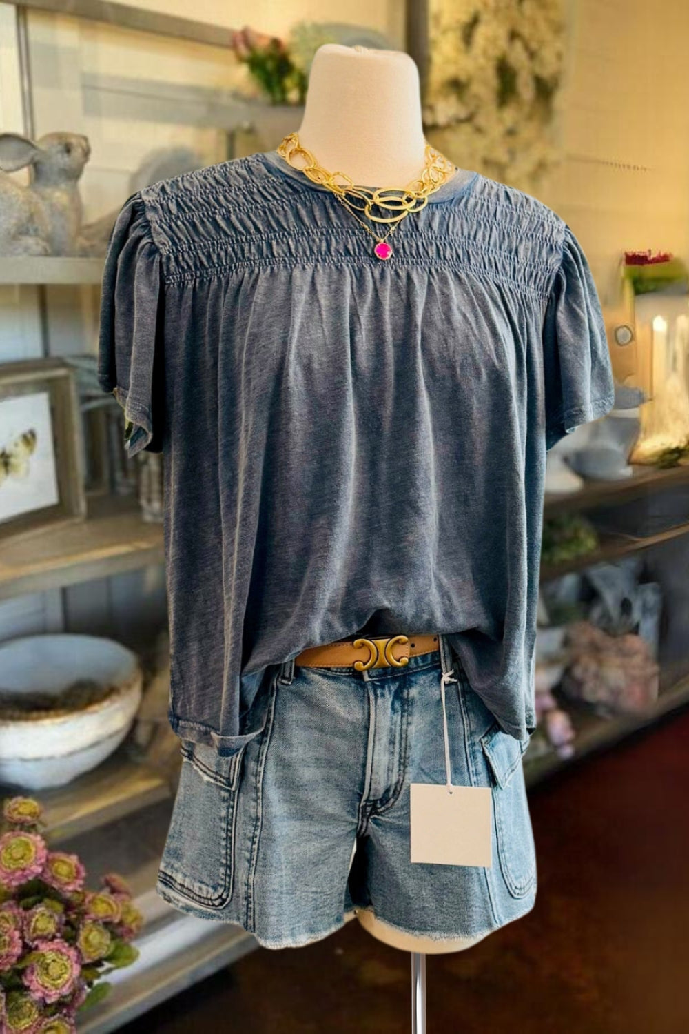 The tee is designed with a mineral wash denim black hue to elevate your style with a touch of edgy sophistication. The smocked detailing adds texture and improves the fit of the tee, resulting in a flattering and stylish silhouette.