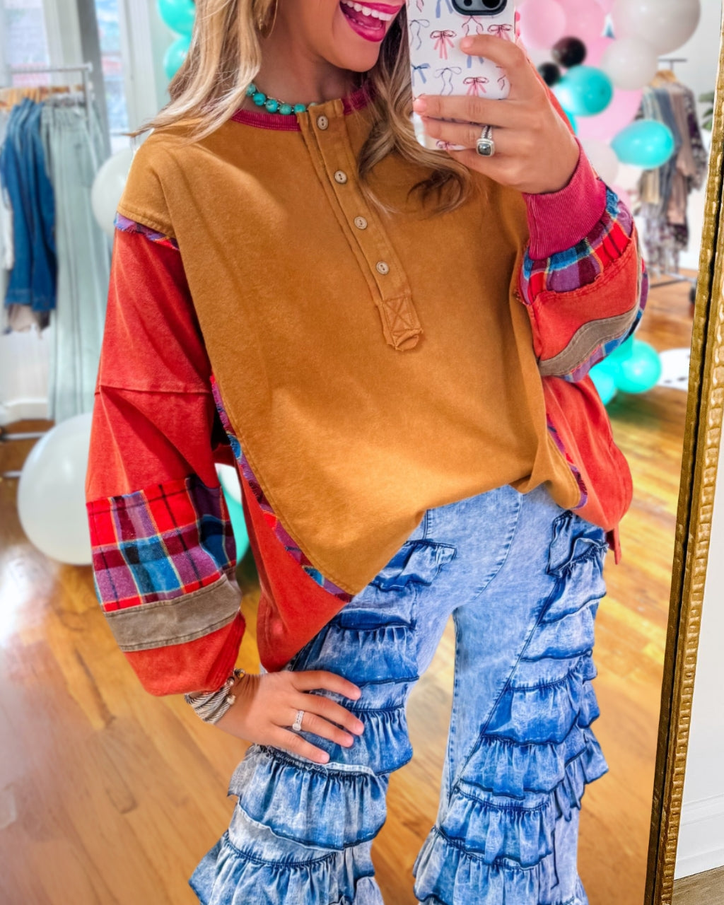 Mixed Plaid Patch Henley Pullover