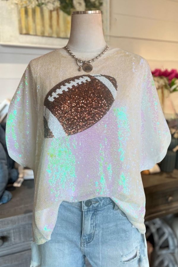 White top with iridescent sequins adorn the front, for a dazzling and eye-catching effect. Relaxed fit with football motif adds sporty-chic to your ensemble. The sequins add glamour and reflect light, making you the center of attention.