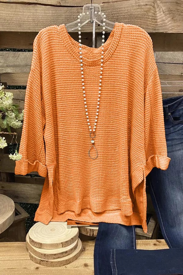Autumn orange waffle pullover in premium cotton-polyester blend. Round neck, 3/4 raglan sleeve design, turn-down cuffs, slit at the hem, long at the back and short at the front. Relaxed fit. Designed to keep you comfortable and looking your best, this pullover is crafted from a lightweight, breathable blend of cotton and polyester that's ideal for milder seasons.