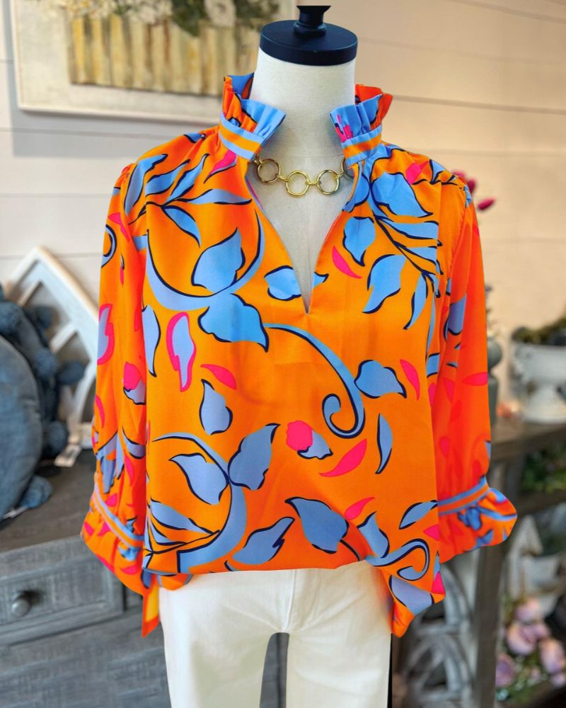Orange Floral Ruffle Neck Top