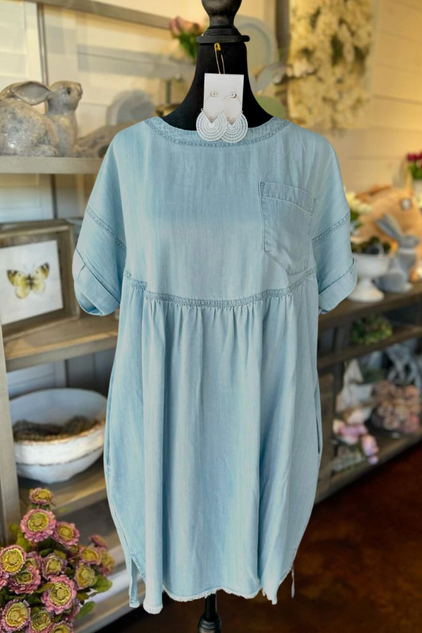 Introduce a vintage-inspired charm to your wardrobe with our Oversize Light Denim Mini Dress. This laid-back piece boasts a relaxed fit, a classic medium denim color, and a rolled-up cuff design. The boat neck and front chest pocket add stylish details while the frayed hem and side slit provide a touch of edge. Plus, the buttonhole back closure ensures a secure fit.