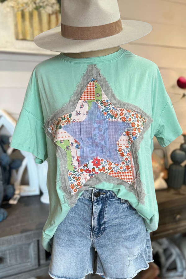 The Mint Tee features a quilted star applique, adding a touch of texture to the design. With a slightly oversized fit, this tee offers both comfort and style.