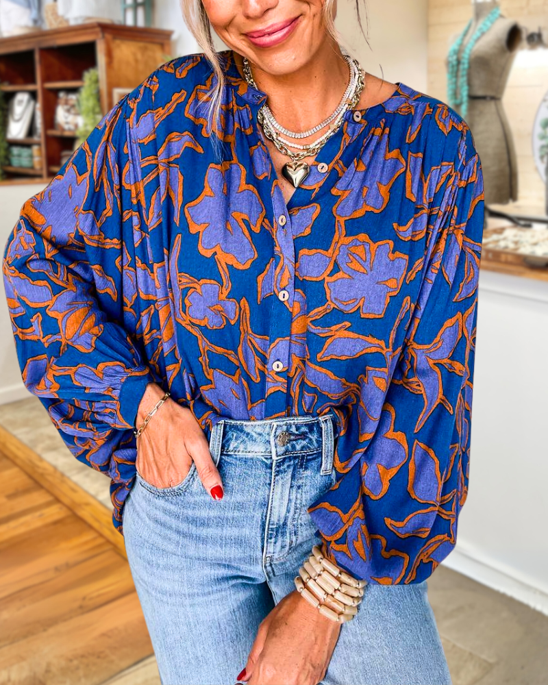 Loose-fitting blouse with button down closure, dolman puff sleeves, and collarless neckline. Ruched shoulders and single cuffs add unique details for a relaxed boho look.