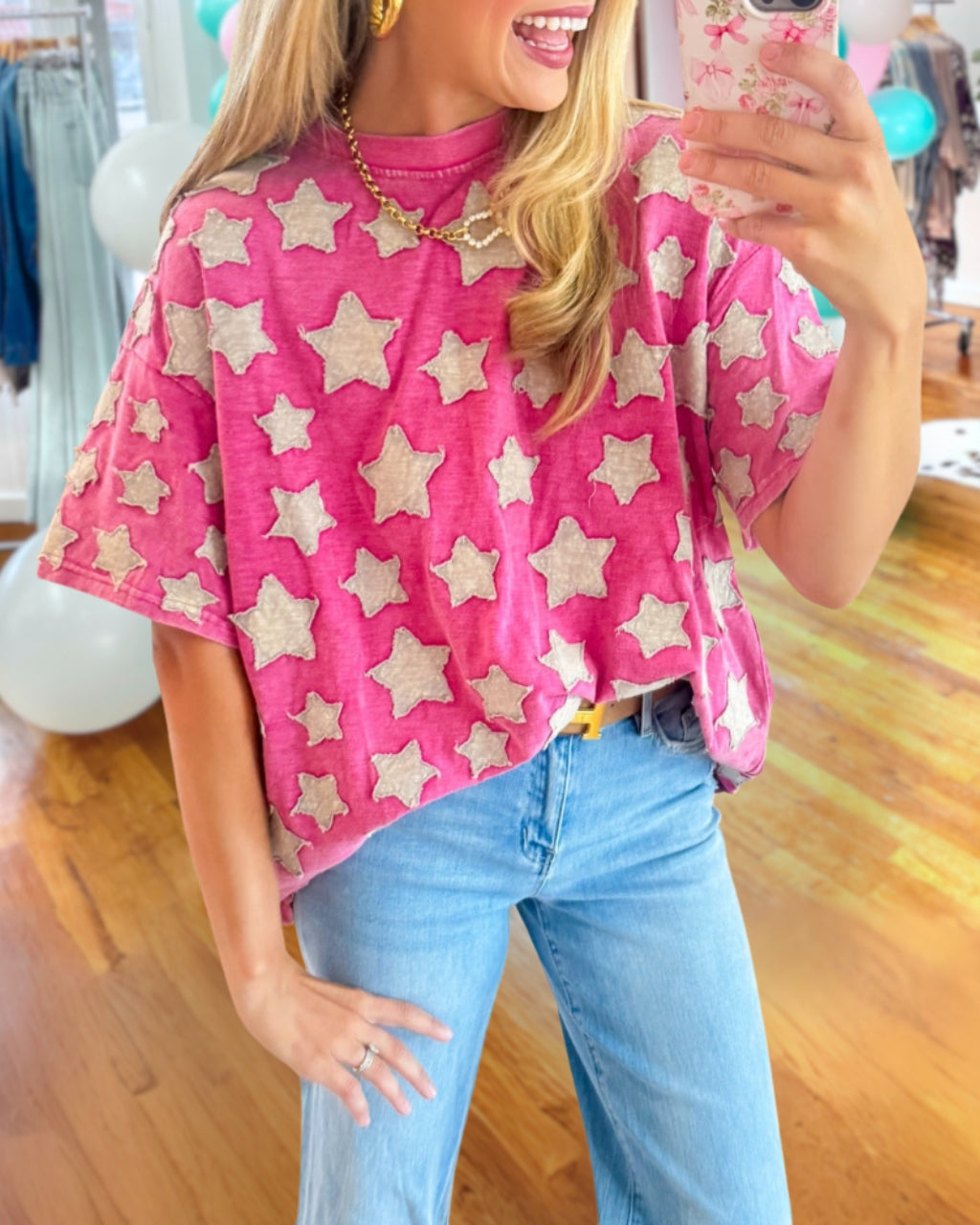 Embrace your playful side with this Pink Star Patch Top! The roomy, oversized fit features convenient side pockets, a flattering round neckline, and cute short sleeves. Perfect for those days when you want to shine while staying comfy!