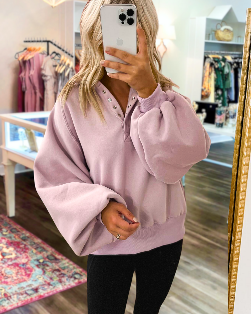The Piper Snap Collared Pullover is designed with an oversized fit, ribbed hem, and a quarter snap closure in either lilac or brown. This long sleeve pullover offers a comfortable and stylish option for any occasion.